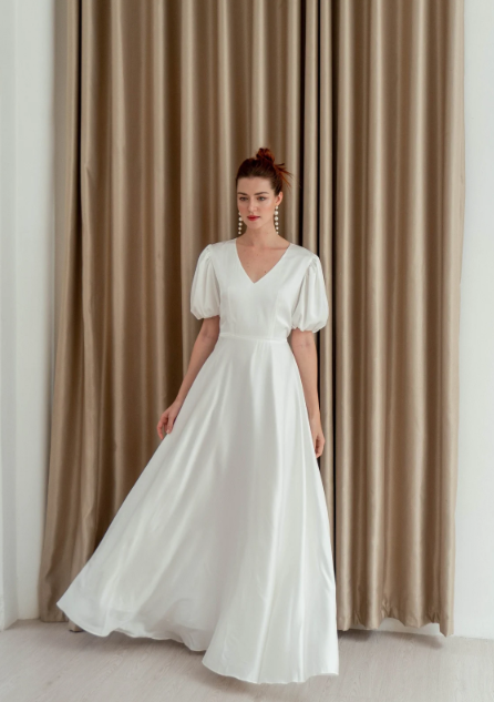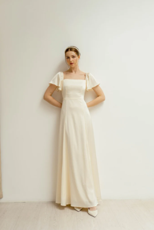 I have to mention this square-neck A-line with flutter sleeves first, because it is so affordable and beautiful at the same time. Simple, yet the satin makes it truly elegant.