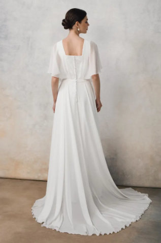 From the flattering flutter sleeves, to the square back, buttons, and train, there is something so breathtaking about this piece.