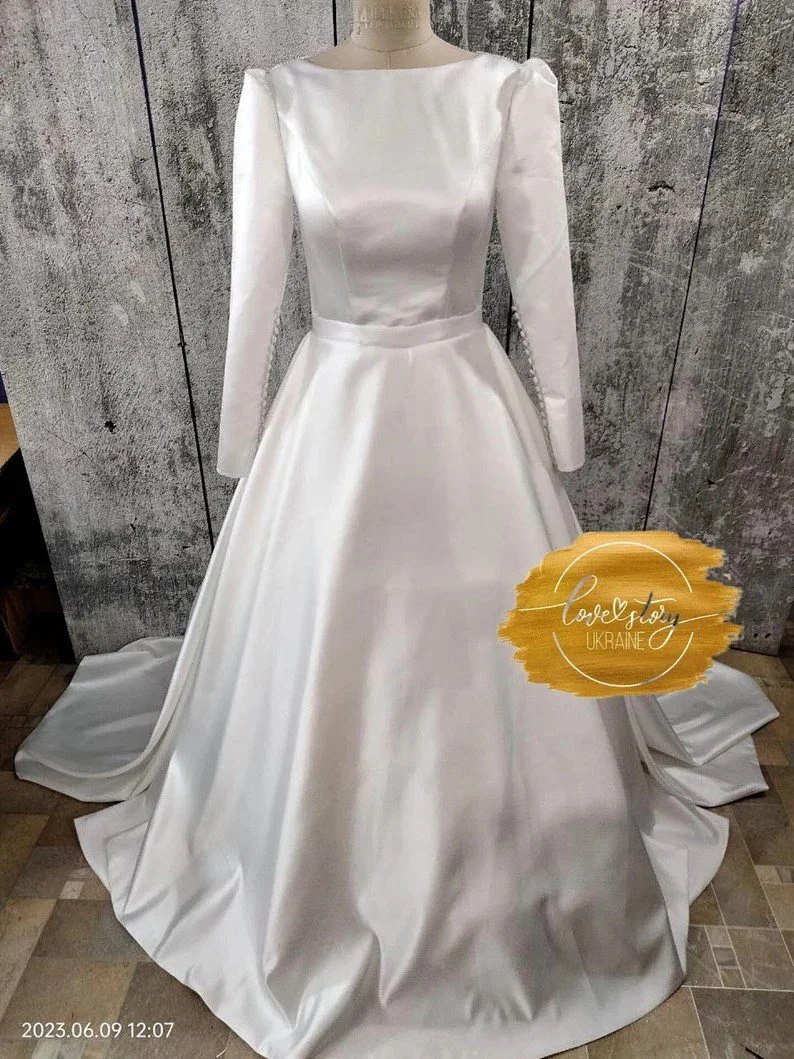 This beautiful satin gown with a vintage boatneck has the option for pockets! a classic A-line, it could easily give a ballgown look with a petticoat underneath.